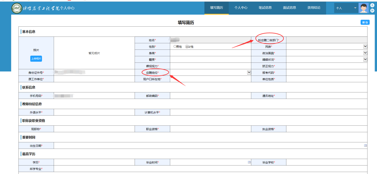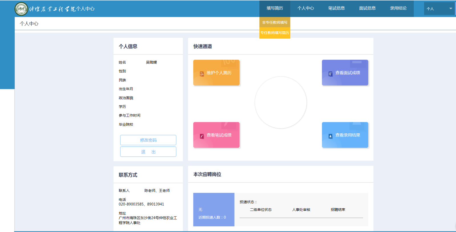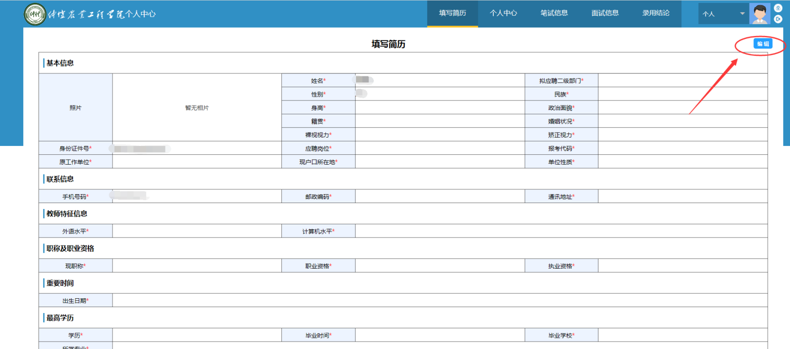 二、登录后进入平台主页面,若未在Frist选择好岗位,请在“填写简历”一栏选择“非专任教师”,点击右上角的“编辑”进行填写。在“拟应聘二级部门”选择“基建处”。