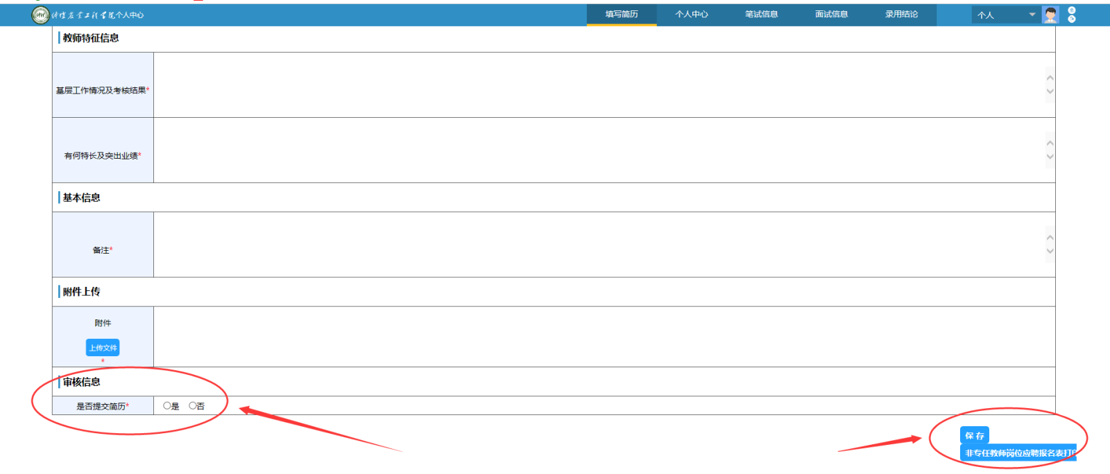 三、简历填写完整后,在“审核信息”中选择提交简历,并点击右下角的“保存”,完成后即为报名成功。