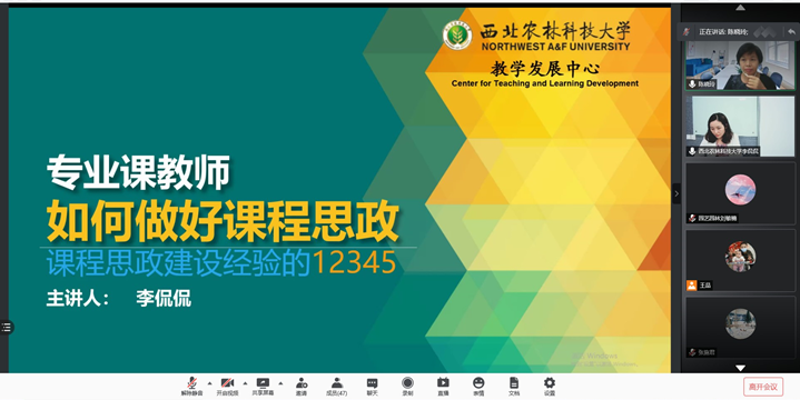 为庆祝中国共产党成立100周年,深入开展党史学习教育,全方位提升教师立德树人的能力水平,6月24日晚,学校开展“学党史 悟思想 重师德 强师能”课程思政教学能力提升系列培训第一讲,邀请西北农林科技大学课程思政培训团队负责人李侃侃副教授作题为《专业课教师如何做好课程思政——课程思政建设经验的12345》专题培训。本次培训由党委教师工作部、教师发展中心主办,园艺园林学院党委承办,园艺园林学院教工第二党支部协办,会议由园艺园林学院党委书记陈晓玲主持,党委教师工作部部长唐明勇及全校130余名对课程思政教学有兴趣的教师参加。
