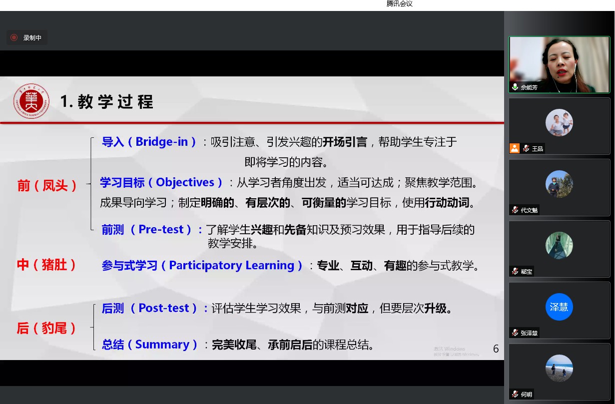 3月23日晚,学校2022年第2期教师教书育人能力提升系列培训在线上举行,会议邀请全国青教赛一等奖获得者、华中师范大学佘能芳老师作题为“基于BOPPPS教学模式的教学设计--以青教赛为例”专题培训。本次培训由党委教师工作部、教师发展中心主办,学校第十届中青年教师教学竞赛参赛教师及部分教师代表参加了培训。会议由人事处副处长吴艳云主持。