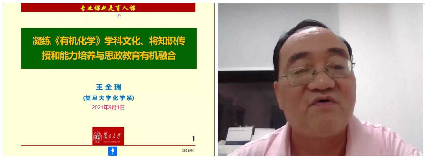 9月1日晚上,由党委教师工作部、教师发展中心主办,化学化工学院党委承办的“学党史 悟思想 重师德 强师能”课程思政教学能力提升系列培训第三讲通过视频会议举行,邀请复旦大学化学系博士生导师王全瑞教授作题为“专业课也是育人课:如何凝练《有机化学》学科文化,将知识传授和能力培养与思政教育有机融合”专题报告。会议由化学化工学院党委书记邱树华主持。