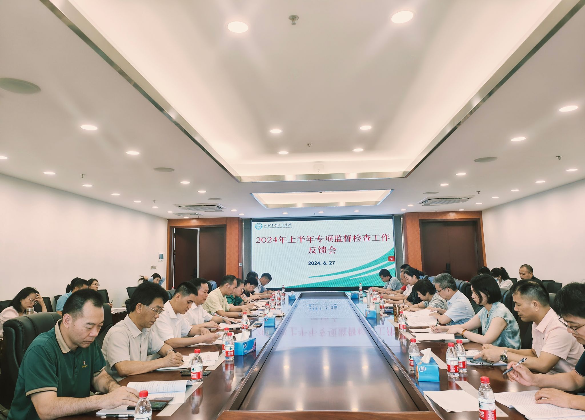6月27日,学校在行政楼600会议室召开2024年上半年专项监督检查工作反馈会。学校专项监督检查工作领导小组办公室主任,专项监督检查组组长,人力资源部、科学技术部班子成员,二级学院党组织书记,纪检监察室专职干部参加会议。