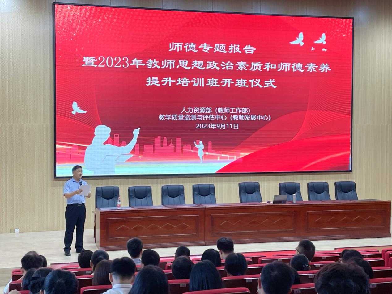 为深入学习贯彻习近平总书记关于教育的重要论述和教师队伍建设的重要指示精神,持续加强和推进教师思想政治素质和师德师风建设,以学校开展2023年师德建设主题教育月活动为契机,9月11日上午,人力资源部(教师工作部)、教学质量监测与评估中心(教师发展中心)在白云校区学术报告厅举办了师德专题报告暨2023年教师思想政治素质和师德素养提升专题培训班开班仪式,会议由人力资源部(教师工作部)部长尹国强主持,培训班学员和全体新进教职工参加。
